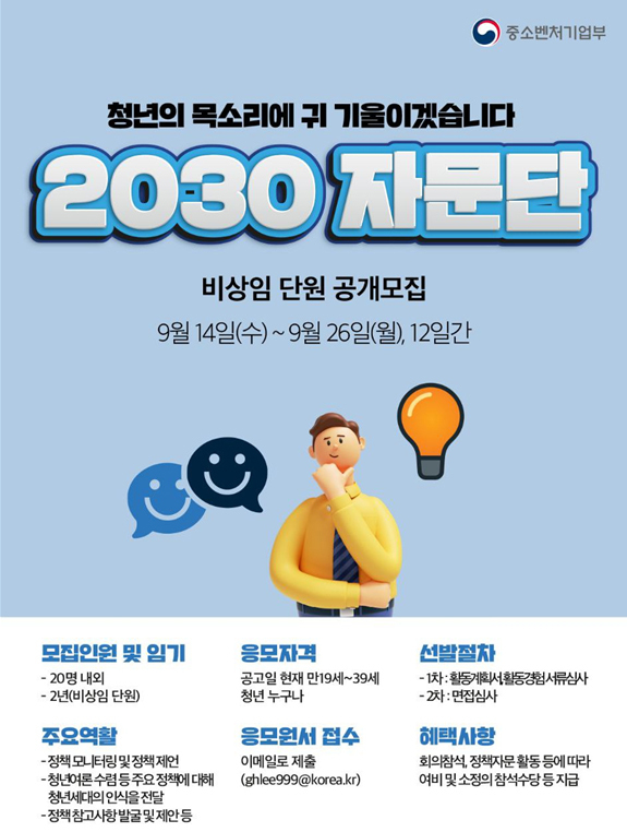 중소벤처기업부는 청년들의 목소리를 정책에 반영하기 위해 창구역할을 수행할 ‘2030 자문단’ 비상임 단원을 공개모집한다고 13일 밝혔다.