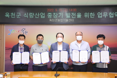 충북 옥천군은 농업기술센터에서 관내농협 및 농업인단체와 '식량산업 중장기 발전'을 위한 업무협약을 체결했다고 19일 밝혔다.