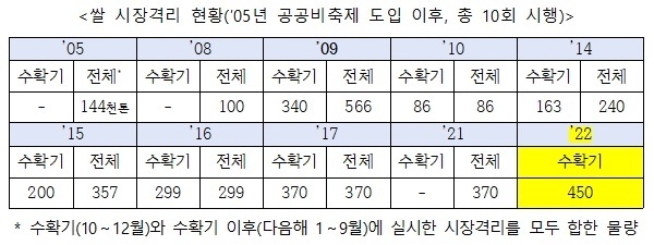 이에 농식품부는 올해 수확기 쌀값 회복을 위해 초과 생산량에 2021년산 구곡 재고량을 더한 것보다 더 많은 물량을 시장에서 격리하기로 결정했다.