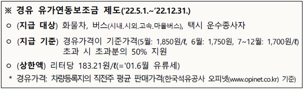 올해 초 유가 급등으로 소득이 감소한 교통·물류업계를 지원하기 위해 지난 5월 1일 도입돼 오는 30일까지 한시적으로 시행되고 있다.