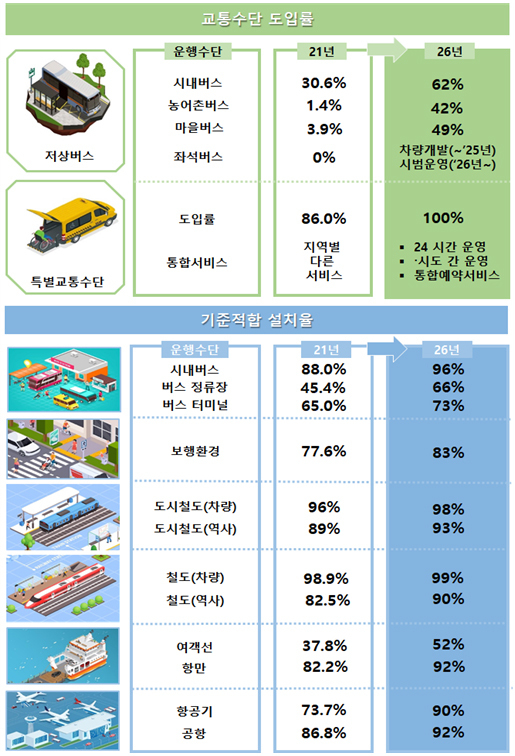 국토부는 2026년까지 교통약자가 이용 가능한 교통수단을 획기적으로 확대하고 이동편의 시설을 개선하기 위해 5년간 약 1조 2000억원을 투입한다는 계획이다.