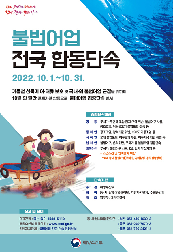 해양수산부는 가을철 성어기를 맞아 오는 10월 한 달 동안을 불법어업 전국 합동단속 기간으로 정하고 지자체, 해양경찰청 등 관계기관과 함께 집중 지도·단속을 실시한다고 28일 밝혔다.