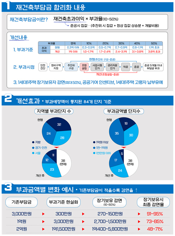 권혁진 국토부 주택토지실장은 “이번 개선방안으로 과도한 재건축부담금 규제가 합리화될 수 있을 것”이라며 “이번 방안이 법률 개정사항인 만큼 입법과정에서 국회와 긴밀히 협력할 계획”이라고 밝혔다.