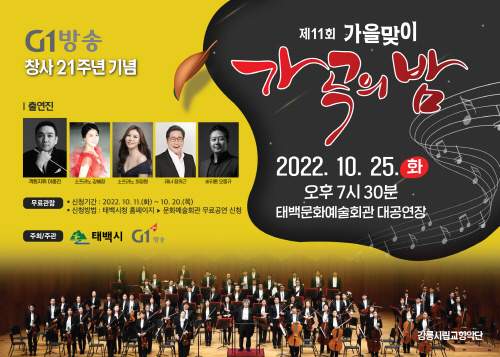강원 태백시(시장 이상호)는 오는 25일 오후 태백문화예술회관 대공연장에서 G1방송과 함께 '제11회 가을맞이 가곡의 밤' 무료공연을 개최한다고 밝혔다.