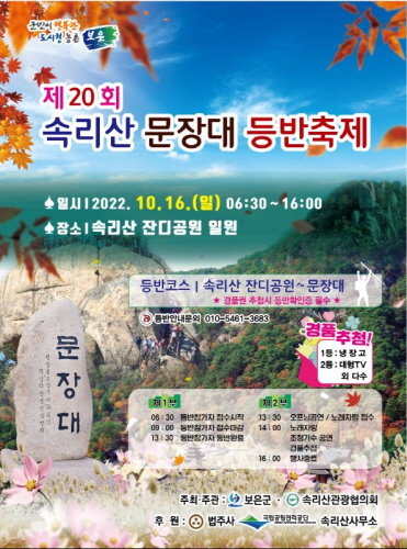 충북 보은군은 제20회 속리산 문장대 등반축제가 오는 16일 속리산에서 열린다고 밝혔다.