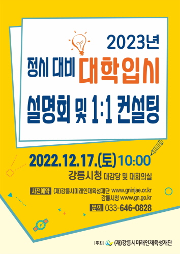 (재)강릉시미래인재육성재단은 오는 17일 오전 강릉시청 대강당 및 대회의실에서 2023년 정시 대비 대학 입시 설명회 및 1:1 맞춤형 대입 컨설팅을 개최한다고 밝혔다.
