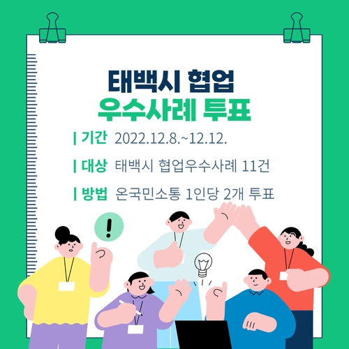 국민투표는 오는 8일부터 12일까지 온 국민소통 홈페이지 국민심사 항목에서 '태백시 협업 우수사례 투표'를 선택해 참여할 수 있다. 우수사례로 추천된 총 11건 중 2건을 선택해 투표하면 된다.