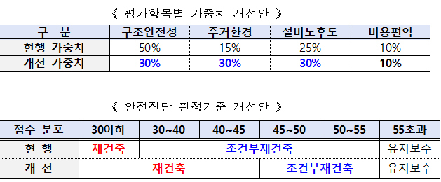 합리화 방안에 따라 앞서 안전진단 평가항목의 구조안전성 비중을 50%에서 30%로 낮추고 주거환경 점수 비중은 현행 15%에서 30%로, 설비노후도의 비중은 현행 25%에서 30%로 각각 높인다.