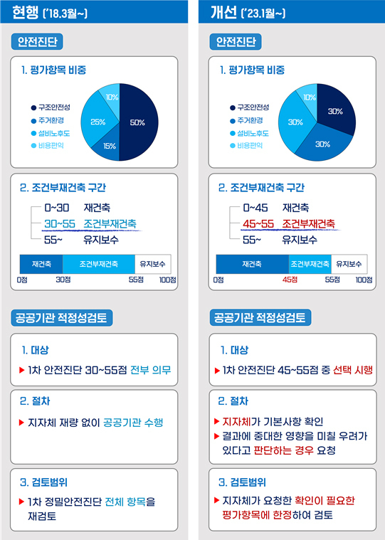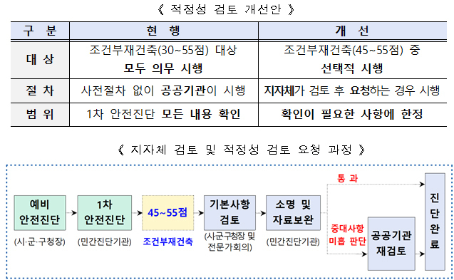 또 공공기관이 적정성 검토를 요청하는 경우에도 1차 안전진단 내용 전체가 아니라 미흡한 부분에 한해 적정성 검토를 하도록 제도를 개선하기로 했다.
