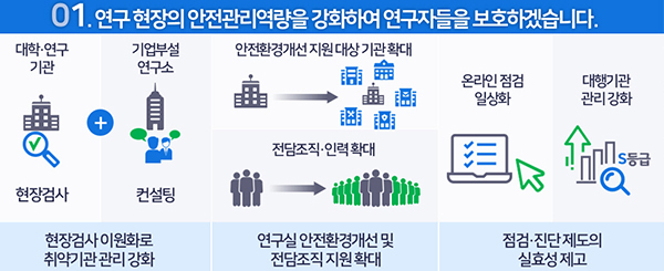 연구현장에서의 안전관리 취약·미흡 요인을 사전에 탐지해 집중관리하고, 안전 취약기관의 안전 역량을 강화해 나간다.