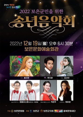 충북 보은군은 '2022년 보은군민을 위한 송년음악회'가 오는 19일 오후 보은문화예술회관에서 성대하게 개최된다고 밝혔다.
