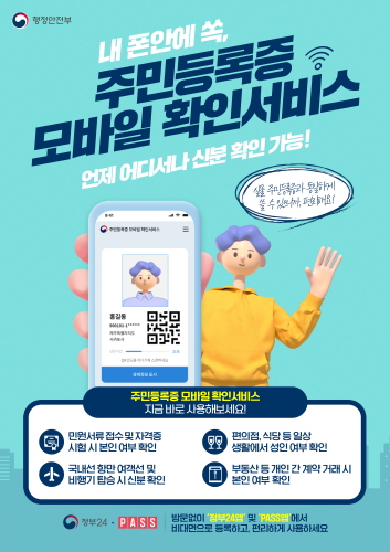 '주민등록증 모바일 확인서비스'는 실물 주민등록증과 동일한 효력을 가지며 주민등록증에 수록된 사항(성명, 사진, 생년월일, 주민등록기관) 및 QR코드가 스마트폰 화면에 나타난다.
