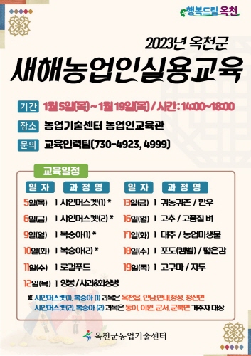충북 옥천군농업기술센터(소장 이재창)는 5일부터 19일까지 11일간 '2023년도 새해농업인실용교육'을 시작한다고 밝혔다.