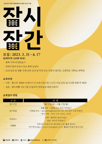 교육생 모집인원 20명으로 오는 17일까지 양잠산업에 관심이 있는 충북 농업인이나 도내 농업 및 생물·곤충 관련 교과 및 학과(전공) 학교 재학생은 충청북도문화재연구원에 신청하면 된다.