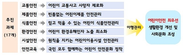 이번 시행계획은 어린이안전 최우선 생활환경 개선 및 사회문화 조성을 목표로 교통안전, 제품안전, 식품안전, 환경안전, 시설안전, 안전교육 6개 분야별로 추진계획을 담았다.