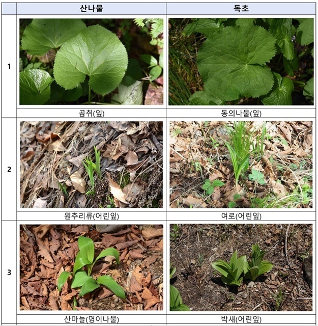 정부 관계자는 “일반적으로 산나물과 독초를 구분하기 쉽지 않으므로 채취하지 않는 것이 독초 섭취를 피할 수 있는 가장 좋은 방법”이라며 “식용 가능한 산나물도 올바른 조리방법을 확인하고 섭취할 것”을 당부했다.