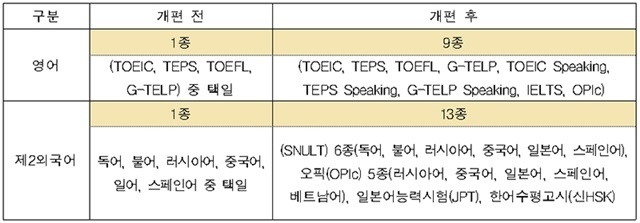 하지만 이번에 공공기관 채용시험 시 활용되는 어학성적에 5종이 추가됐다. 영어 9종, 제2외국어 13종 등 최대 22종까지 등록해 관리할 수 있게 됐다.