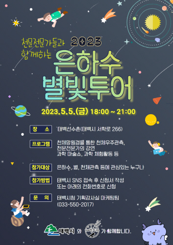 이번 행사는 어린이날인 5월 5일 저녁 6시부터 9시까지 1330m 고지대에 위치한 태백선수촌에서 진행될 예정이며, 프로그램은 천체망원경을 이용한 천체관측, 천문학 명사 초청 강연, OX 퀴즈, 과학 마술쇼, 과학 체험 등 다양한 활동이 준비돼 있다.