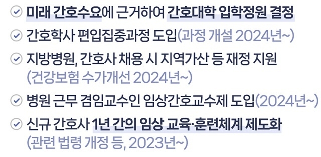 또한 미래 간호수요 증가에 맞추어 한시적으로 간호대학 입학정원을 계속 늘리고, 간호대학 학사편입제도를 ‘간호학사 편입집중과정’을 중심으로 재편될 수 있도록 지원한다.