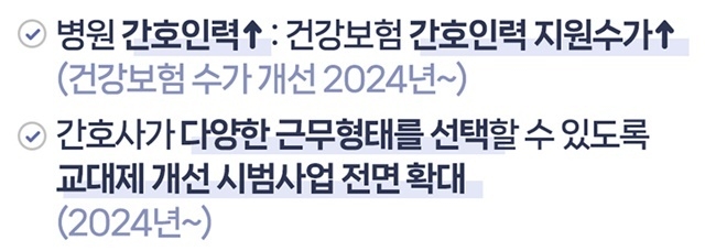 또한 병원에서 간호인력을 더 많이 배치할수록 병원과 간호사가 더 많은 보상을 받을 수 있도록 올해 중에 건강보험의 관련 제도(간호등급제) 개편방안을 마련한다.