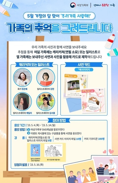 여가부는 4일부터 14일까지 여가부 SNS를 통해 사연과 사진을 모집하며 1인 가구, 한부모가족, 대가족 등 다양한 가족이 참여할 수 있다.