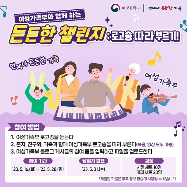 여가부의 표어인 ‘언제나 든든한 가족’을 바탕으로 제작된 로고송을 따라 부르는 모습을 촬영 또는 녹음해 여가부 블로그에 접수하면 된다.