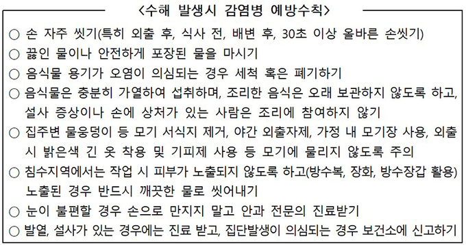 특히 풍수해 감염병 예방을 위해 안전한 물과 음식을 섭취하고, 손씻기 등 위생수칙을 철저하게 준수해 줄 것을 당부했다. 아울러 지자체에는 모기 등 매개체 급증을 방지하기 위한 철저한 방제를 요청했다.