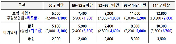 이에 풍수해 보험 가입자는 위로금을 포함해 최소 5600만 원에서 최대 1억 2800만 원까지, 미가입자도 주택 크기에 따라 위로금 3100만 원을 포함 5100만 원에서 최대 6700만 원의 위로금을 합쳐 1억 300만 원을 지원받는다.