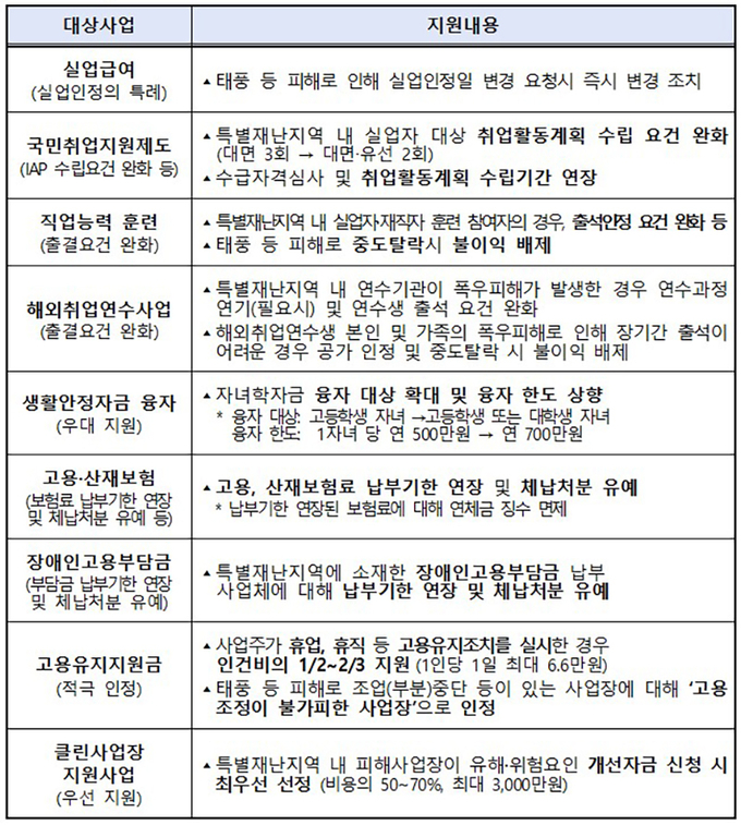 정부가 태풍 ‘카눈’ 피해 지역의 신속한 일상회복을 위해 실업급여, 직업훈련, 산업안전 등과 관련한 필요한 조치를 신속히 지원하기로 했다.