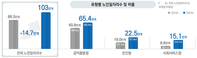 노인 일자리는 역대 최고 수준인 14만 7000명을 확대해 어르신 103만 명에게 일자리를 제공하고, 노인 일자리 수당도 6년 만에 7%(월 2만~4만 원) 인상되고 기초연금도 월 32만 3000원에서 33만 4000원으로 올라 안정적인 노후 생활을 지원한다.