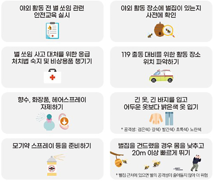 이에 질병청은 벌 쏘임 주요 예방법으로 벌을 자극하는 향이 있는 물품 사용 자제, 밝은색 옷 입기, 긴 옷을 이용해 팔·다리 노출 최소화, 벌집 접촉 시 신속대피 등을 안내했다.