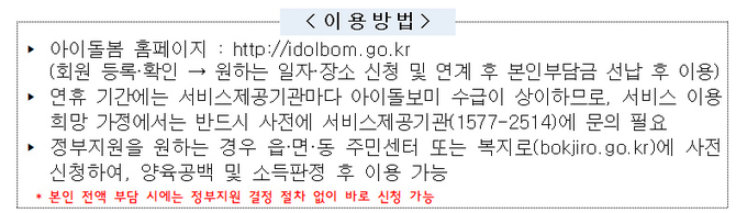 한편 추석 연휴기간에도 돌봄 서비스가 필요한 가정을 위해 아이돌봄서비스를 정상 운영하고 이용요금도 평일 요금(시간당 1만 1080원)을 적용한다.