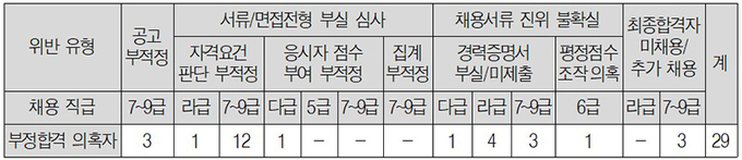 또한 면접위원을 내부위원으로만 구성해 외부 위원을 50% 이상 위촉해야 하는 규정을 위반했으며, 우대기준에 부합하지 않은 가점을 부여하고 응시자가 제출한 경력 등 증빙자료에 대한 검증·확인 절차 없이 181명을 합격자로 임용했다.