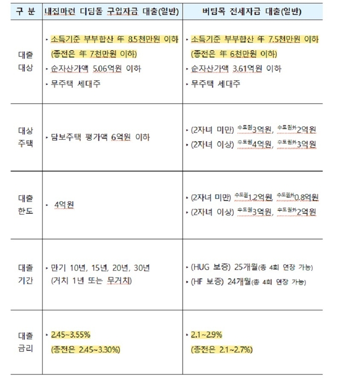 디딤돌 대출의 경우 당초 부부합산 연 7000만원에서 8500만원까지 소득요건이 늘어난다. 금리는 2.45~3.55%(소득 7000만원 이하는 2.45~3.30%)를 적용받는다. 대출 기간은 만기 10년, 15년, 20년, 30년 중 선택 가능하다. 원할 경우 1년간 거치(대출 원금을 상환하지 않고 일정 기간동안 미뤄놓는 것)도 가능하다.