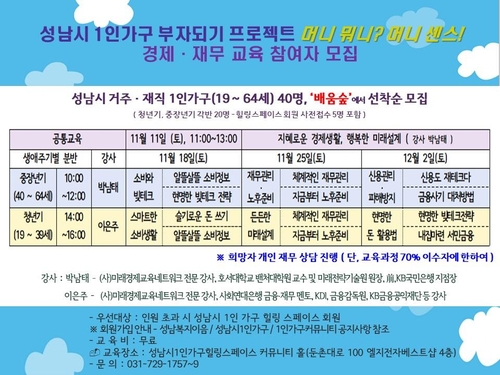 성남시(시장 신상진)는 1인 가구의 재무상담 및 생활경제교육을 위한 특별 교육프로그램을 11일부터 매주 토요일 4주간 운영한다고 6일 밝혔다.