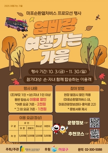 한편, 마포구는 한국관광공사, ㈜카카오모빌리티와 협력해 11월 30일까지 마포순환열차버스를 반값으로 이용할 수 있는 특별 프로모션도 진행하고 있다.