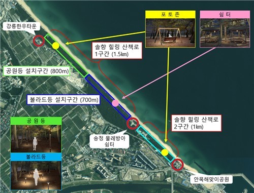 이어 2차 공사 구간인 송정물레방아쉼터에서 안목해맞이공원까지 약 1㎞ 구간도 2026년 내 기존 쉼터 및 벤치 등에 야간 포토존과 볼라드등을 설치할 예정이다.