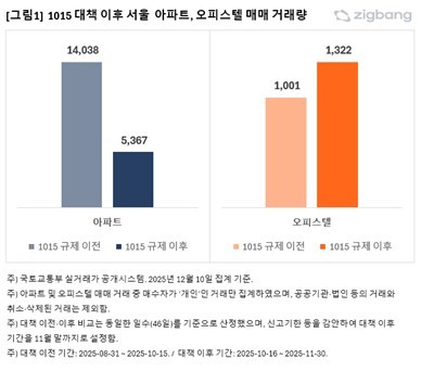 아파트는 이전부터 시행된 대출규제 강화에 더해 10·15 대책에 따른 토허구역 확대와 규제지역 지정으로 투자성 매수가 제한되면서 실수요 중심 거래만 남은 영향으로 거래량이 급감한 것으로 풀이된다. 반면 오피스텔은 규제 초점이 아파트에 맞춰진 결과 수요가 유지된 것으로 보인다.