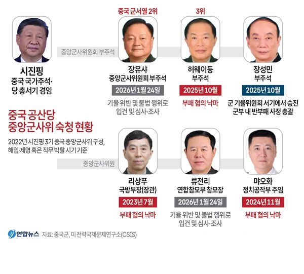 26일 중앙통신사(CNA)와 자유시보, 중시신문망 등 대만 매체들 보도를 종합하면 지난 24일 장 부주석과 류전리 중앙군사위원(연합참모부 참모장)이 한날한시에 숙청된 것은 시 주석이 군에 대한 통제력을 더욱 공고히 하는 과정에서 나타난 결과라고 전문가들이 분석했다.