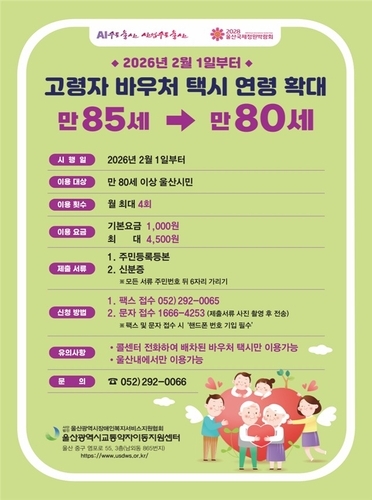 【국제일보】 울산시는 오는 2월 1일부터 교통약자(임산부, 영아, 고령자) 이용권(바우처) 택시 이용 고령자 대상을 만 85세에서 만 80세 이상으로 확대한다고 밝혔다.