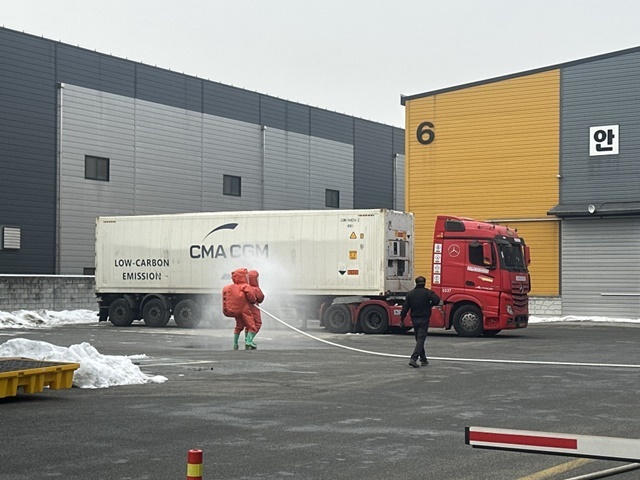 소방당국은 컨테이너 내부 온도가 올라가며 해당 물질이 누출된 것으로 보고 방수를 통해 냉각 작업을 벌이고 있다.