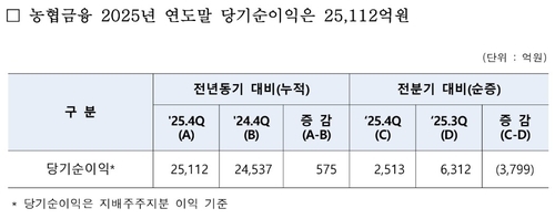 (서울=연합뉴스) NH농협금융지주는 지난해 당기순이익이 2조5천112억원으로, 전년보다 2.3% 증가했다고 11일 밝혔다.