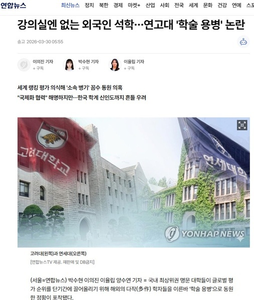 (서울=연합뉴스) 한국기자협회는 제427회 이달의 기자상 기획보도 부문 수상작으로 연합뉴스 박수현·이의진·이율립·양수연 기자의 '국내 명문대 '학술 용병' 의혹'을 선정했다고 16일 밝혔다.