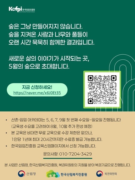 교육 신청은 한국임업진흥원 교육신청 페이지 또는 네이버폼(QR코드)을 통해 가능하다.