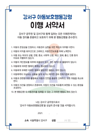 서울 강서구(구청장 노현송)는 오는 26일 아동이 안전하고 행복한 환경을 만들어나가기 위해 '아동보호 행동강령'을 선포한다고 밝혔다.
