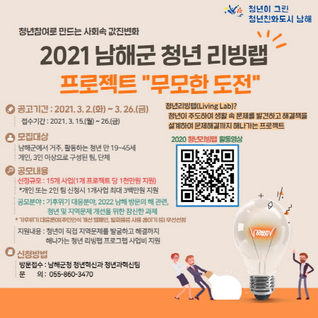 남해군은 청년의 사회참여 역량강화와 청년활동 활성화를 위해 2021년도 청년 리빙랩 프로젝트 '무모한 도전' 사업 참가자를 오는 26일까지 모집한다고 2일 밝혔다.