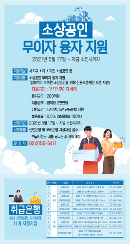 서울 서초구(구청장 조은희)는 코로나19 장기화로 인해 피해를 받아 긴급 수혈자금이 절실한 관내 소상공인을 대상으로 200억 원 규모의 무이자 융자지원을 시행한다고 13일 밝혔다.