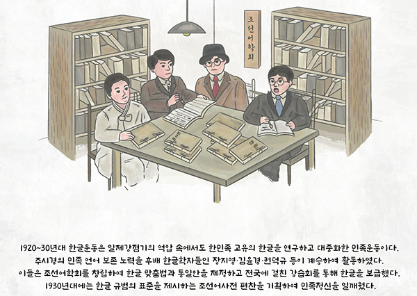 1935년 1월부터는 표준어 사정위원으로 참여해 2년 동안 약 1만 개의 어휘를 정립한 1942년 ‘조선어대사전’을 발행했는데, 조선총독부는 한글 말살정책 강화와 연구자들을 탄압하기 위해 ‘조선어학회사건’을 일으켰고 이에 연루된 선생은 모진 고문을 받다가 1944년 10월에 석방됐다.