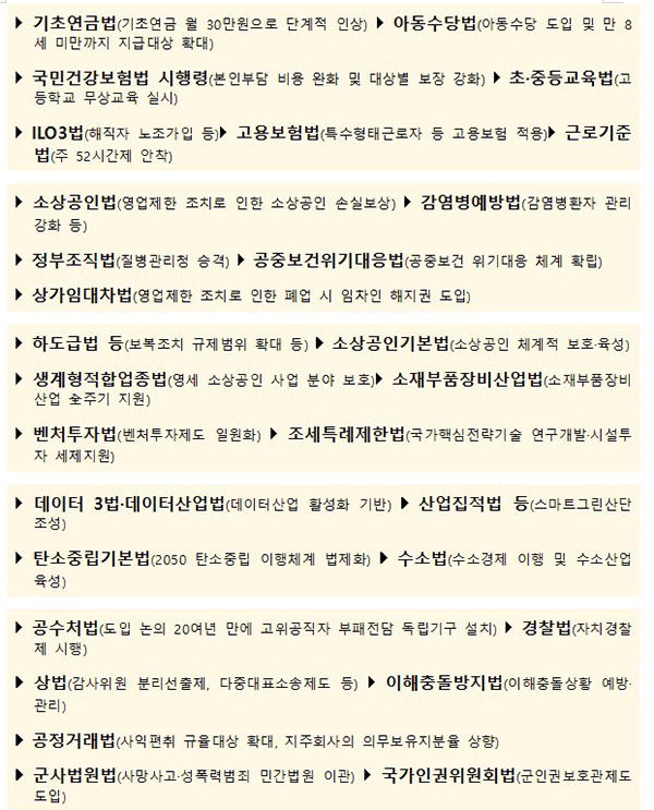 한편 정부도 문재인정부 입법성과가 사회 곳곳에 제대로 안착되어 국민들이 실제 삶에서 변화를 체감할 수 있도록 마지막까지 후속조치 추진에도 최선을 다할 계획이다.