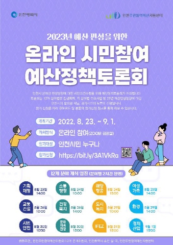 인천광역시(시장 유정복)는 민선 8기 시정목표와 공약 추진 등 주요 정책을 시민과 소통·공감하고자 오는 23일부터 9월 1일까지 온라인예산정책토론회를 개최한다고 밝혔다.
